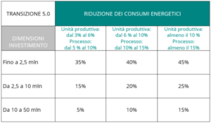 Il piano Transizione 5.0 finanzia progetti di innovazione che consentano una riduzione dei consumi energetici dell’unità produttiva pari almeno al 3%, o pari al 5% se calcolata sul processo interessato dall’investimento.